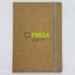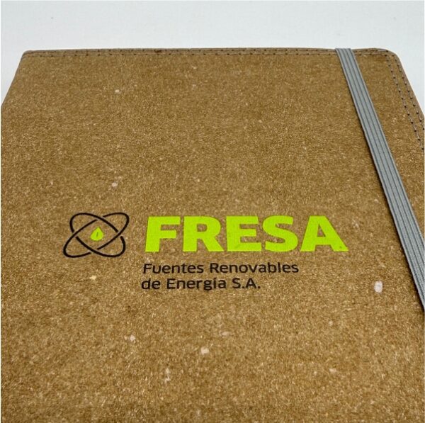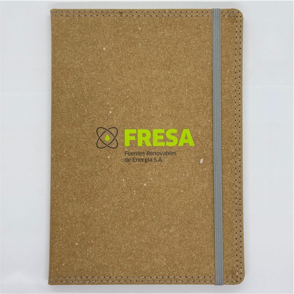 Reconstituido, con detalles de costuras en los bordes. Con 96 hojas lisas. Cuenta con un cierre elástico y una etiqueta tejida.