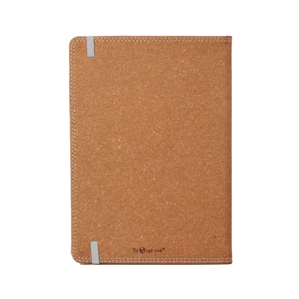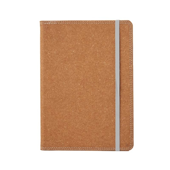 Reconstituido, con detalles de costuras en los bordes. Con 96 hojas lisas. Cuenta con un cierre elástico y una etiqueta tejida.