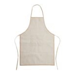 Confeccionado en tela de Jute laminada con TNT, tela no tejida. Cuenta con dos tiras regulables para atar en la cintura y un bolsillo frontal.