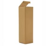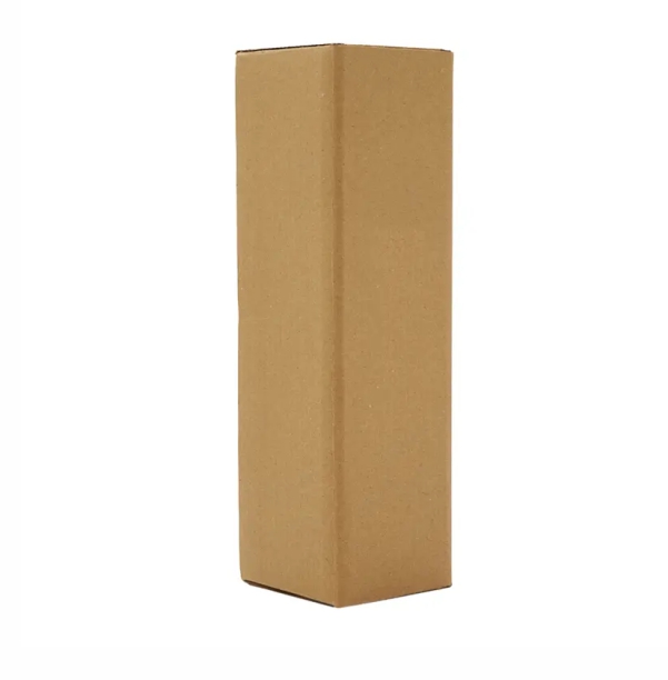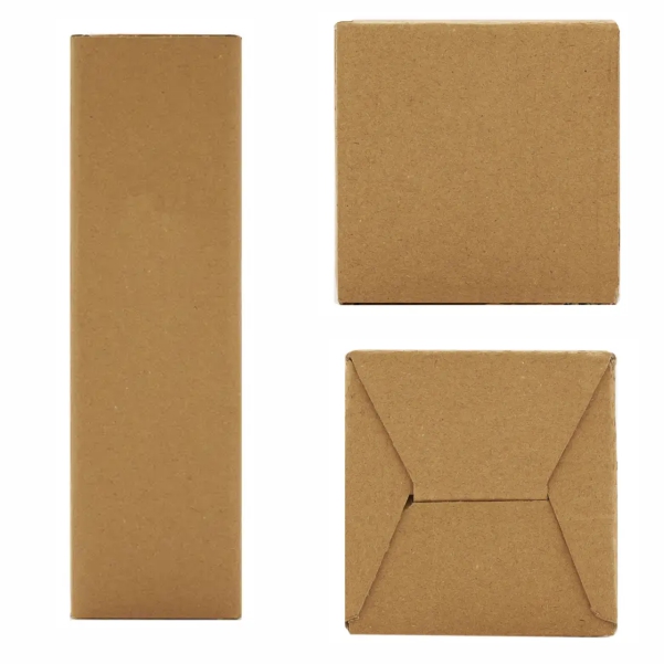 Caja confeccionada en cartón Kraft, elaborado con tres capas: una exterior de 250g, una capa corrugada de 80g, y una interior de 85g.