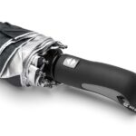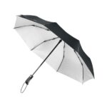 Confeccionado en Pongee 190T de alta resistencia, impermeabilidad y calidad. Posee un robusto marco de 8 varillas de apertura y cierre automático, realizado con un material exclusivo que combina fibra de vidrio y plástico super ligero que le brinda durabilidad y no atrae rayos. Mango de plástico cubierto con una goma, de diseño anatómico para un agarre cómodo y no deslizante en condiciones de húmedad. Incluye funda.